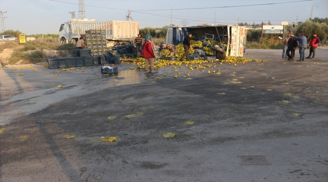 Narenciye yüklü kamyonun devrilmesi sonucu yola dökülen meyveler çevredekilerce kasalara dolduruldu ve yol trafiğe açıldı.