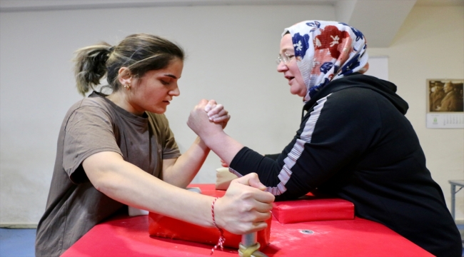 Kadın bilek güreşçiler, Şehit Anıl Gül Spor Salonu'nda milli sporcu Evren Serhat Arslan tarafından haftanın 5 günü gerçekleştirilen antrenmanlarda şampiyonalara hazırlanıyor.