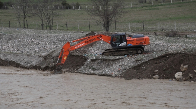 Karayolları 15. Bölge Müdürlüğü ekipleri, Araç Çayı'nın yatağını iş makineleriyle genişleterek akışını yavaşlatmaya çalışıyor.