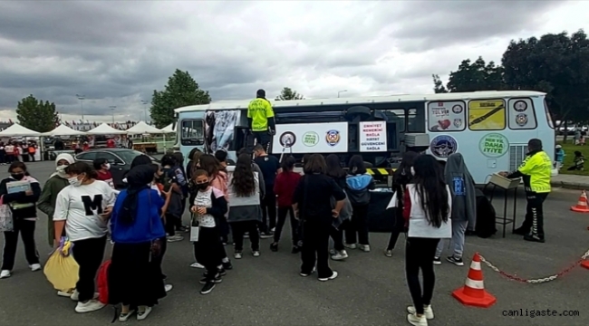 Kayseri 5. Bilim Şenliği'ne katılan çocuk ve yetişkinlere, emniyet kemeri simülasyon otobüsü ile emniyet kemerinin önemi anlatıldı.