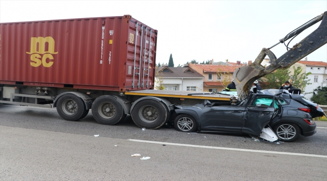 Tırın altında sıkışan otomobil yaklaşık yarım saatlik çalışmayla yoldan kaldırıldı.